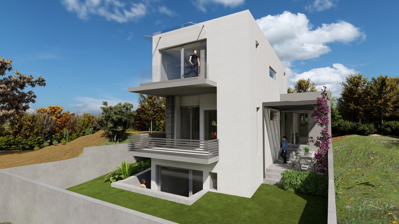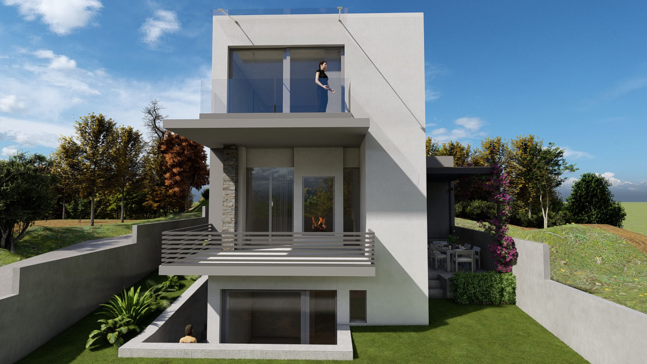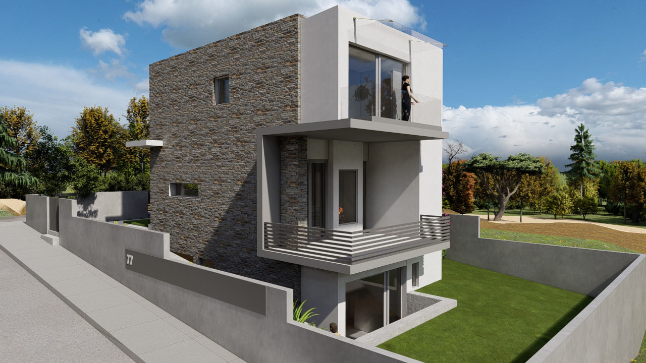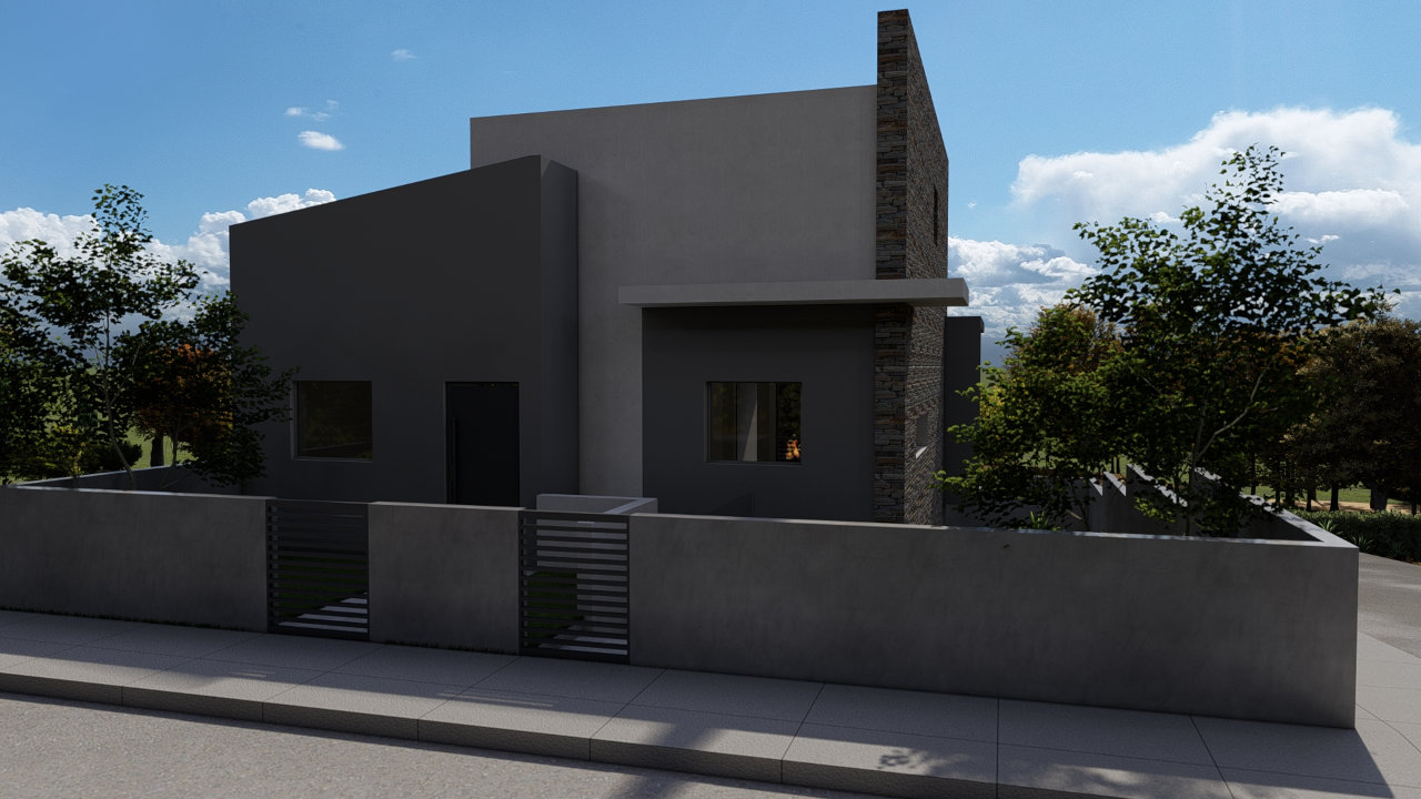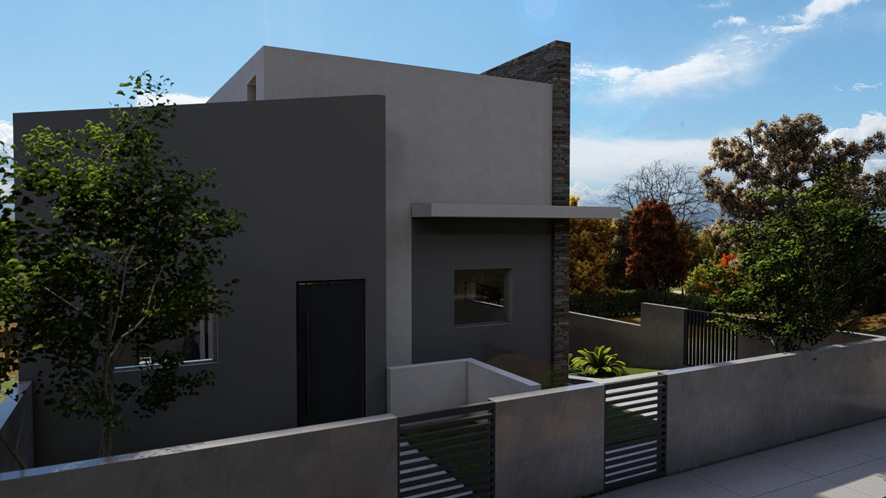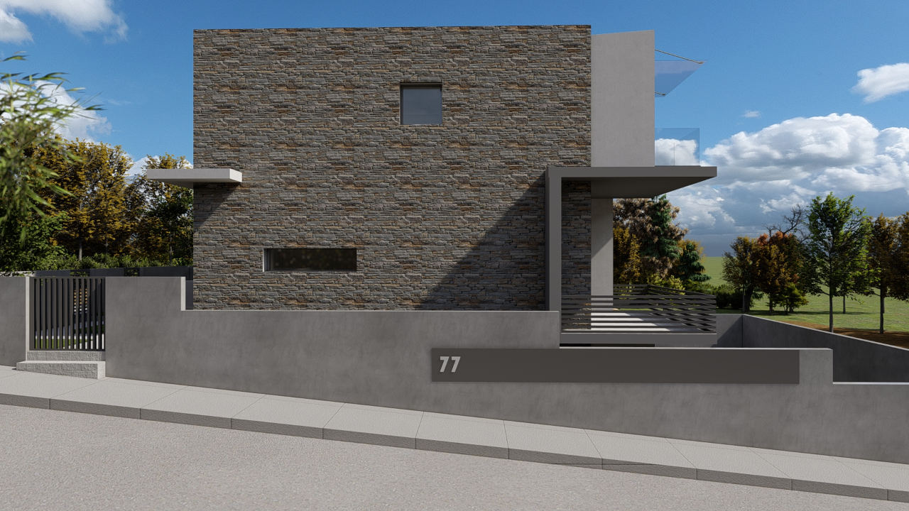 Η επιλογή φυσικών υλικών και η λιτή μορφολογία ενισχύουν τη σύνδεση της κατοικίας με το φυσικό της περιβάλλον. Οι όγκοι του κτιρίου διαφοροποιούνται διακριτικά, ενώ η χρήση πέτρας σε συνδυασμό με αποχρώσεις του γκρι προσδίδει ένα σύγχρονο, αλλά οικείο ύφος.