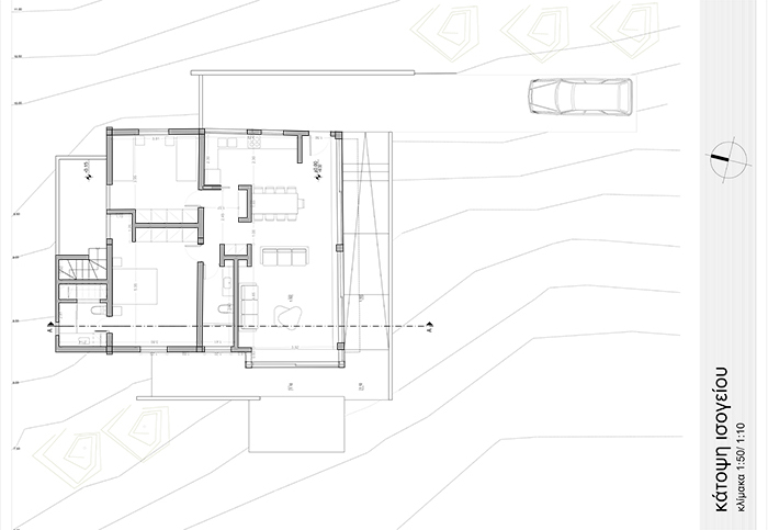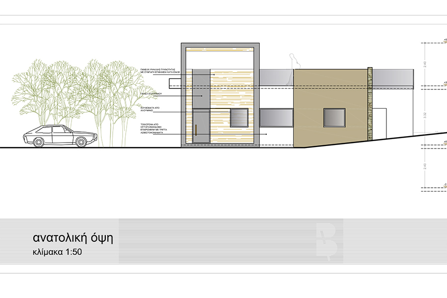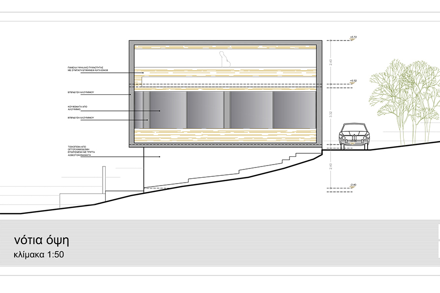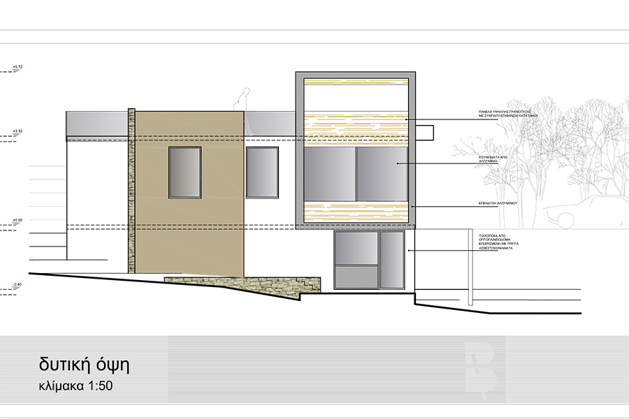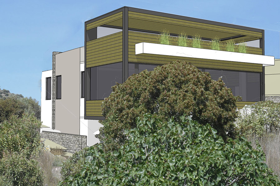 Τα υλικά που έχουν προταθεί είναι ξύλο, αλουμίνιο και πέτρα. Αξιοποιήθηκε τα μέγιστα η θέα προς τη θάλασσα με συνεχόμενα ανοίγματα προς τη θέα και τον σχεδιασμό ενός roof garden η πρόσβαση στο οποίο γίνεται με εξωτερική σκάλα.